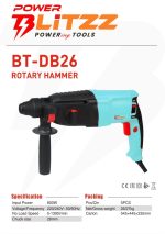 The Blitzz Rotary Hammer 26mm 800W BT-DB26 Hilti Machine is an excellent choice for anyone needing a reliable, powerful, and versatile tool for construction, renovation, or demolition projects. Its combination of power, efficiency, comfort, and ease of use makes it a top pick for both professionals and DIY enthusiasts. Whether you’re drilling, chiseling, or hammering, this tool can handle a variety of tasks with ease.