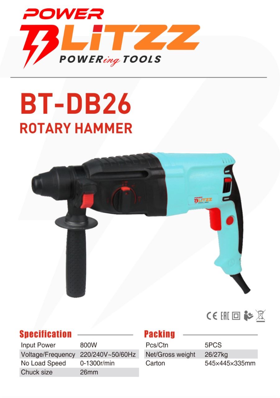 The Blitzz Rotary Hammer 26mm 800W BT-DB26 is a high-performance tool designed for heavy-duty tasks such as drilling, hammering, and chiseling in concrete, brick, masonry, and stone. It is ideal for both professionals and DIY users looking for a powerful, reliable, and versatile rotary hammer for various construction and renovation tasks.